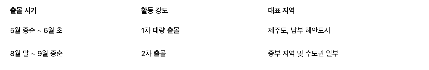 기본적으로 5월과 9월 두 차례 출몰하지만, 해마다 기온과 강수량 변화에 따라 앞당겨지거나 늦춰질 수 있습니다.