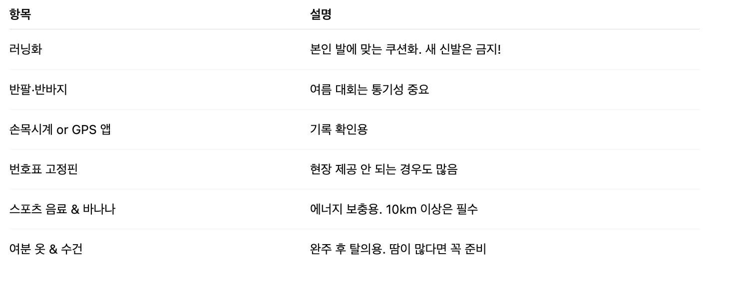 가장 중요한 건 여유 있게 도착하는 것과 충분한 스트레칭입니다. 출발 1시간 전까지 도착해 번호표 확인과 몸풀기를 해두면 긴장을 덜 수 있어요. 물과 간단한 간식, 땀 닦을 수건, 여분 옷은 기본이고, 더운 날엔 선크림과 모자도 꼭 챙기시길 추천드립니다.