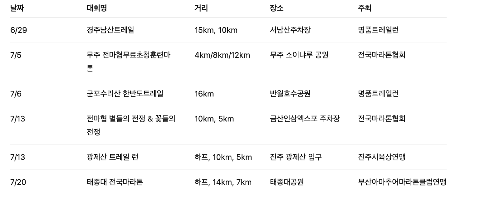 - 6~7월 마라톤 일정표 확인