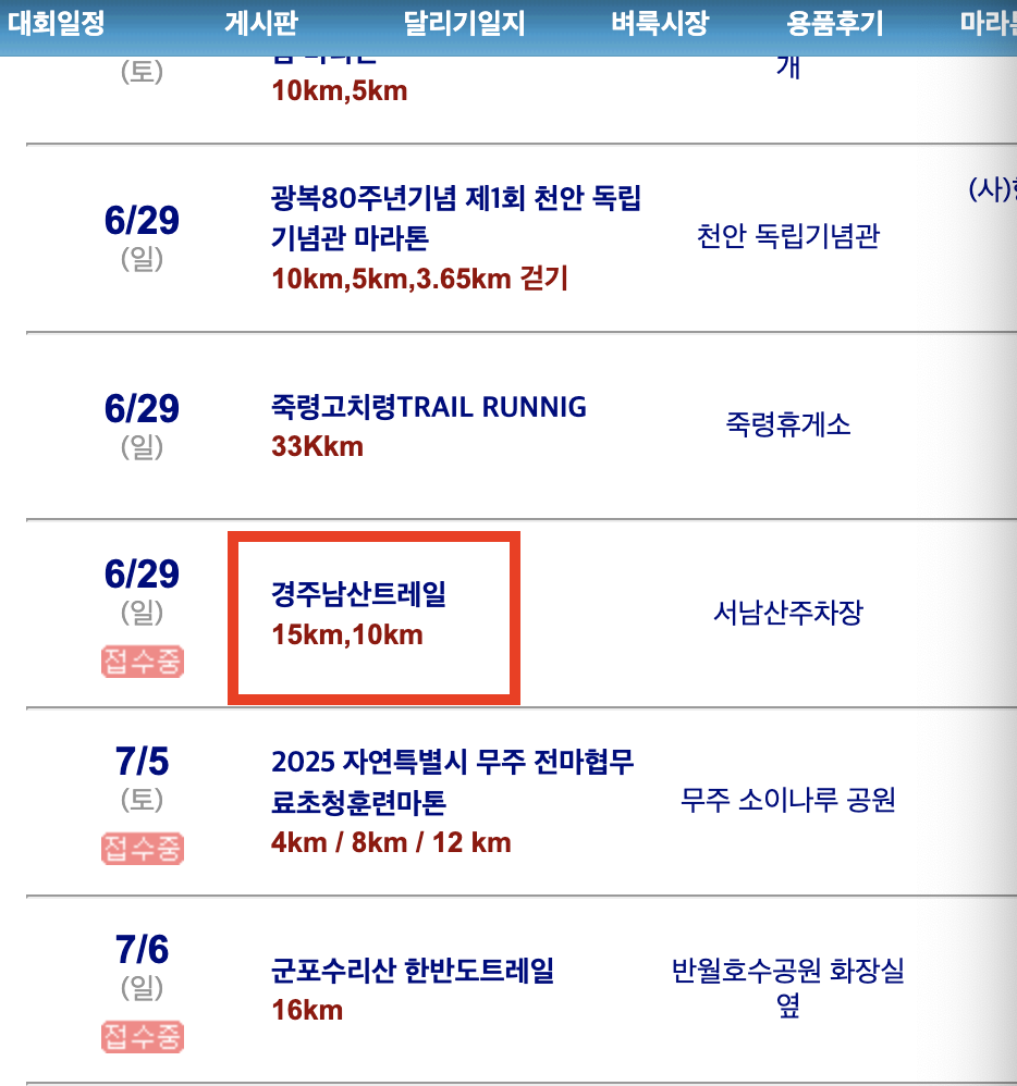 2025년 6월~7월 기준으로 접수 중인 트레일런과 로드런 대회 일정을 소개드릴게요.
