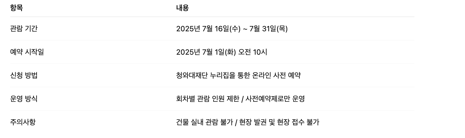 2025년 7월 16일(수)부터 7월 31일(목)까지 청와대 관람이 진행됩니다. 단 7월 1일부터 100% 사전 예약제로 받고 있으며, 기간이 끝나면 언제 다시 청와대를 관람할 수 있을지는 일정이 나와있지 않습니다. 이번이 마지막 기회일 수도 있습니다.