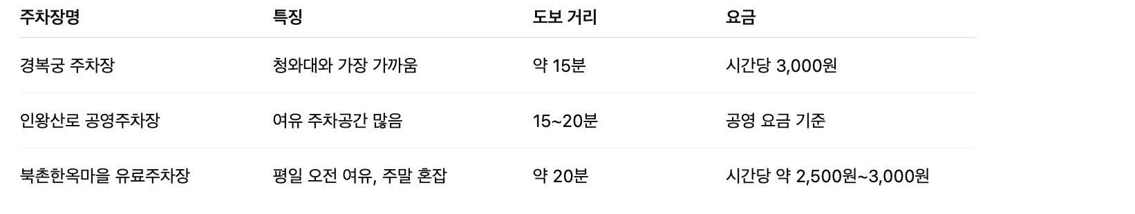 인근 경복궁, 인왕산로, 북촌한옥마을 유료주차장 등을 활용해야 하며, 주말에는 매우 혼잡할 수 있어요.