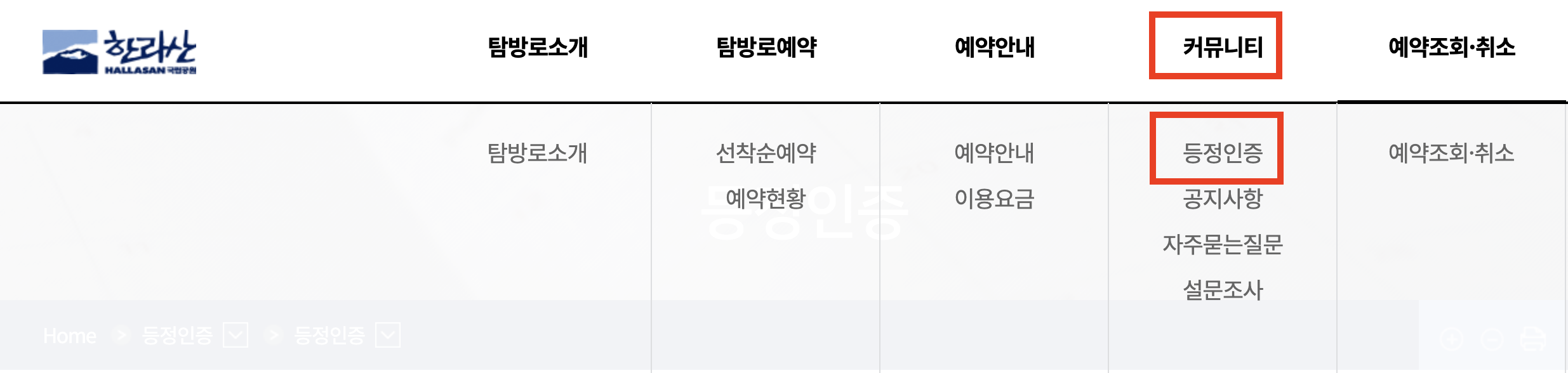 한라산 탐방로예약 시스템 홈페이지에서 아래 사진과 같이 빨간색 표시 박스 부분을 통해 한라산 등정인증서 발급 신청이 가능합니다.