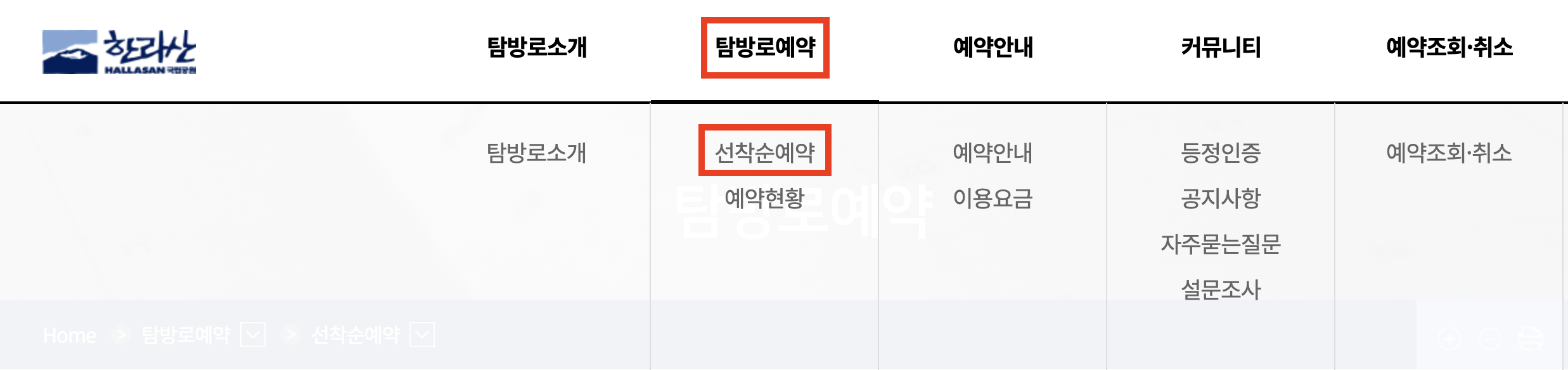 아래의 사진은 한라산 탐방로예약 시스템 예약 홈페이지 화면입니다. 사진과 같이 빨간 표시 부분을 통해 한라산 탐방로예약을 할 수 있습니다.