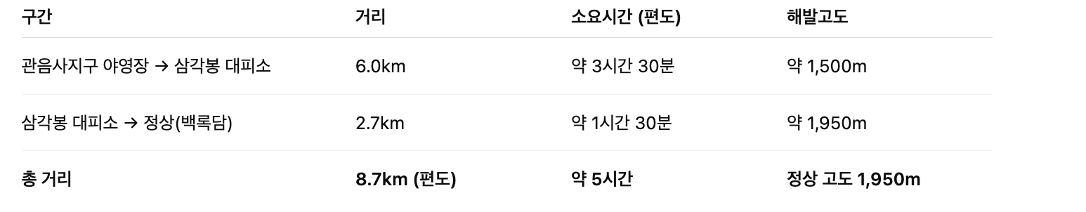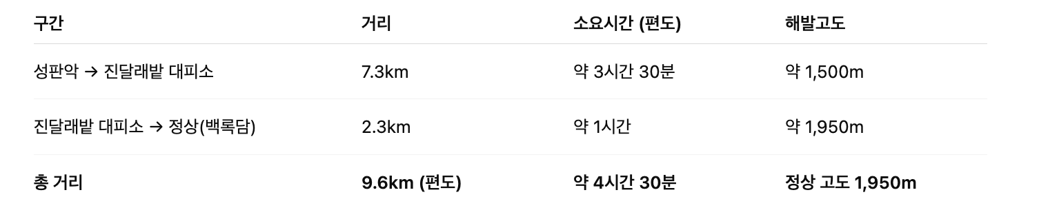 왕복 시 약 17.4km, 총 9~10시간 이상 소요되며 경사도가 높아 고난도 코스에 해당합니다.