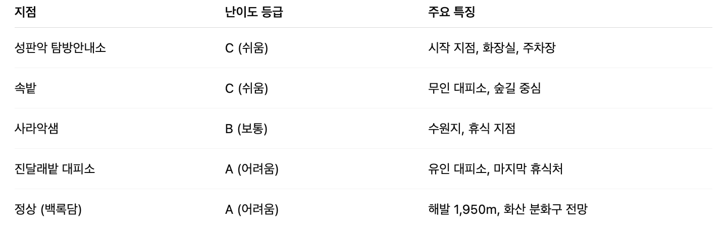 - 코스: 성판악 → 속밭 → 사라악샘 → 진달래밭 대피소 → 정상(백록담)
