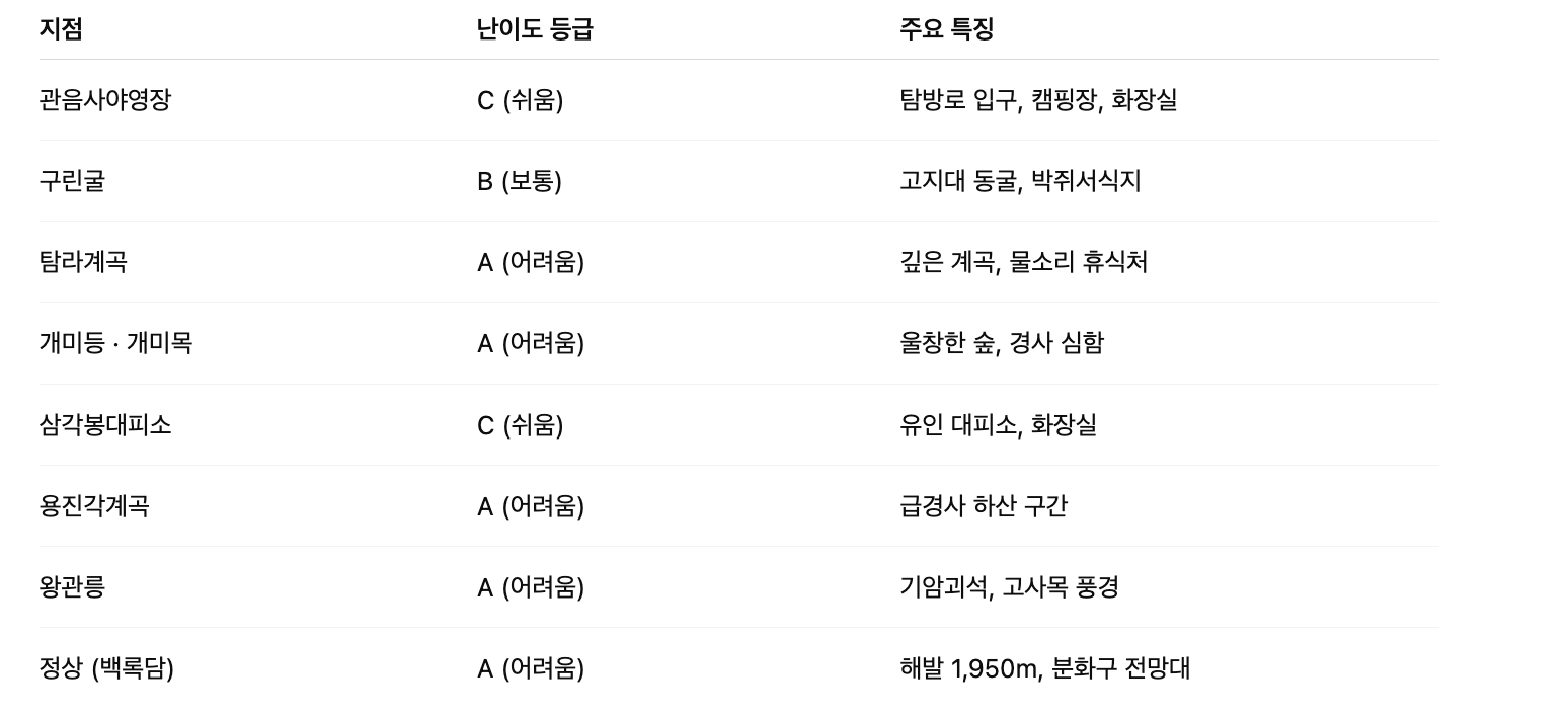 - 코스: 관음사야영장 → 구린굴 → 탐라계곡 → 개미등/개미목 → 삼각봉대피소 → 용진각계곡 → 왕관릉 → 백록담 정상